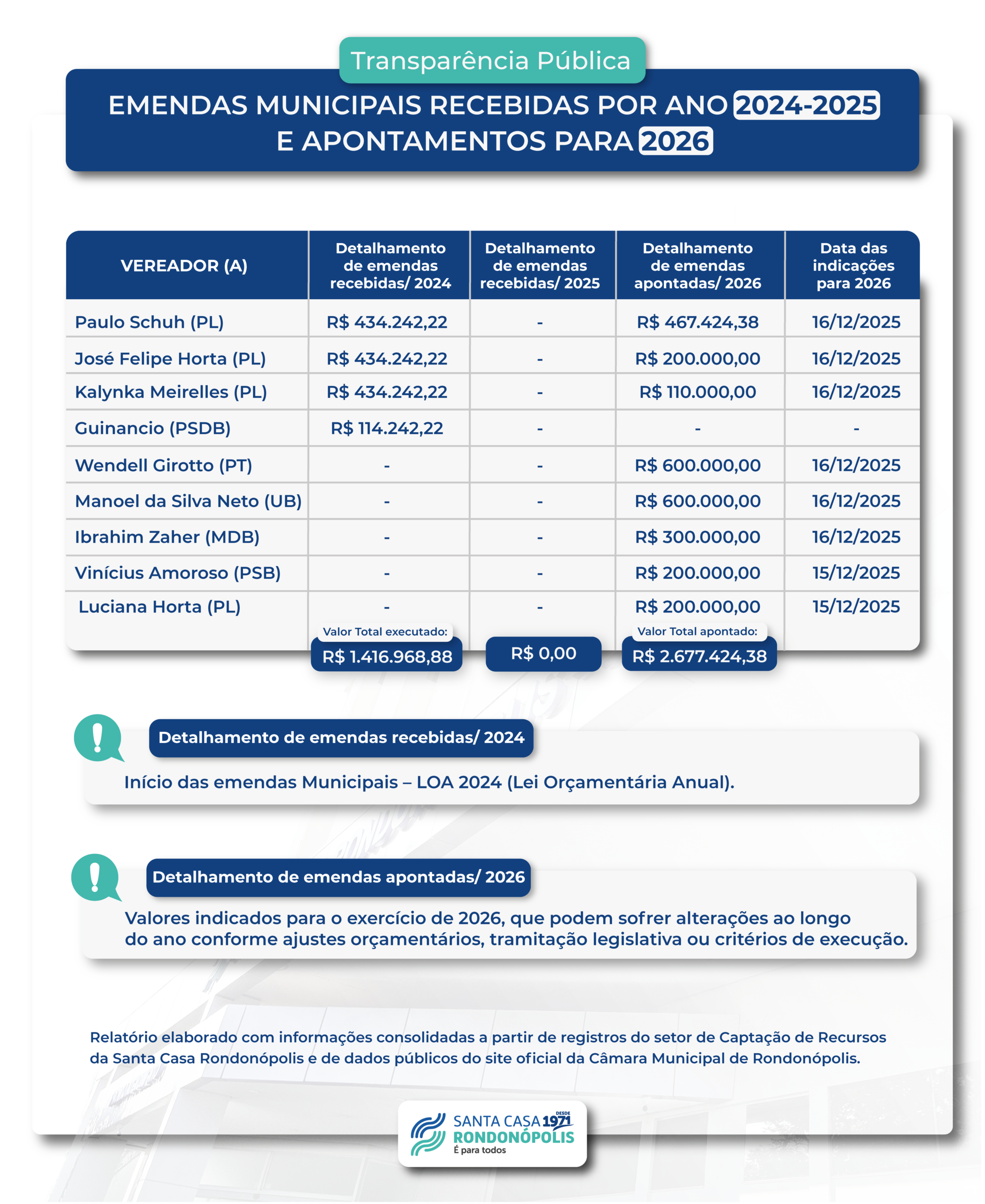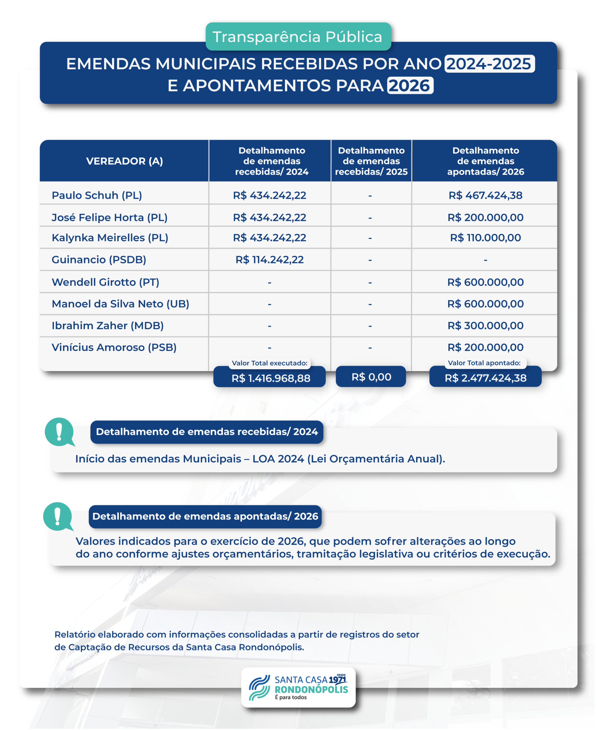 A Santa Casa de Rondonópolis apresenta o relatório com o demonstrativo das emendas municipais recebidas em 2024 e
