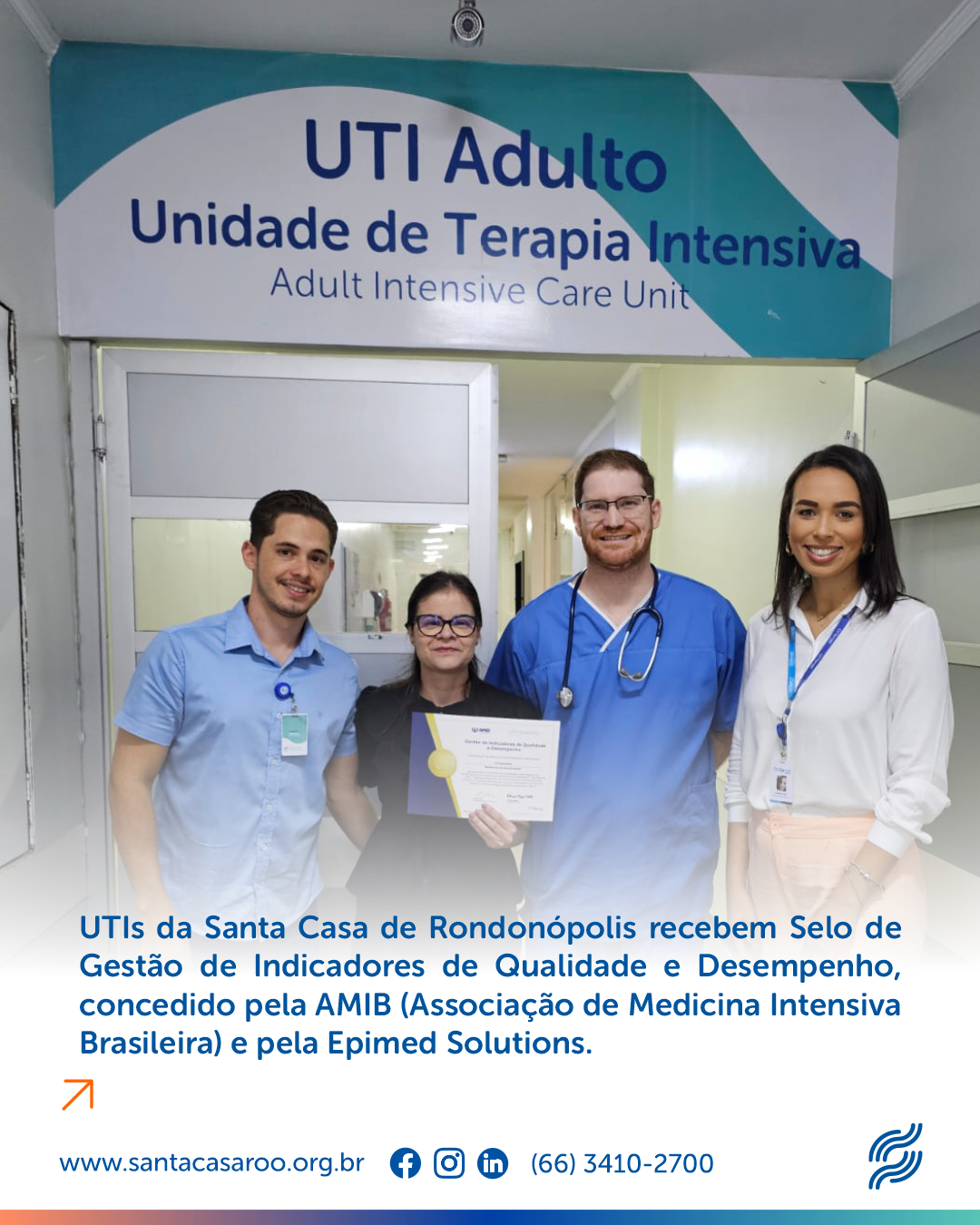 As UTIs da Santa Casa de Rondonópolis acabam de receber o Selo de Gestão de Indicadores de Qualidade e Desempenho, concedido pela AMIB (Associação de Medicina Intensiva Brasileira) e pela Epimed Solutions!