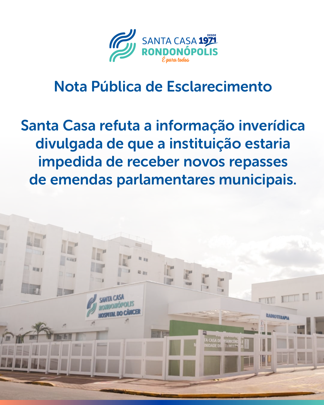 Reafirmamos o compromisso da Santa Casa de Rondonópolis com a ética, a transparência, a responsabilidade na gestão dos recursos públicos e a continuidade dos serviços essenciais prestados à população.